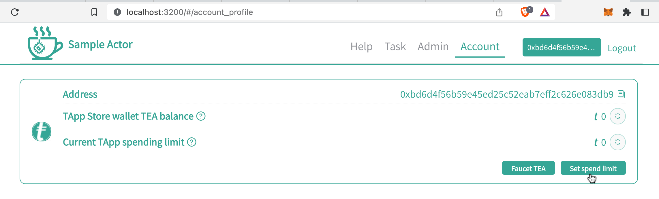 Next you'll need to set the spending limit for the TApp before using it. Each TApp in the TEA Project has a spending limit that is set by the user to ensure that the TApp's business logic can withdraw user funds only up to that amount.